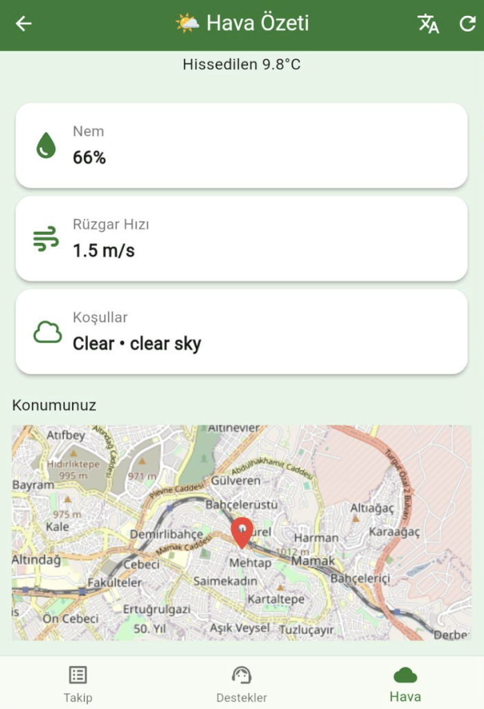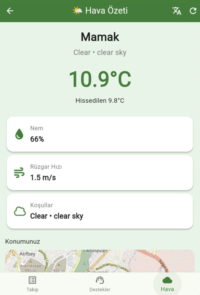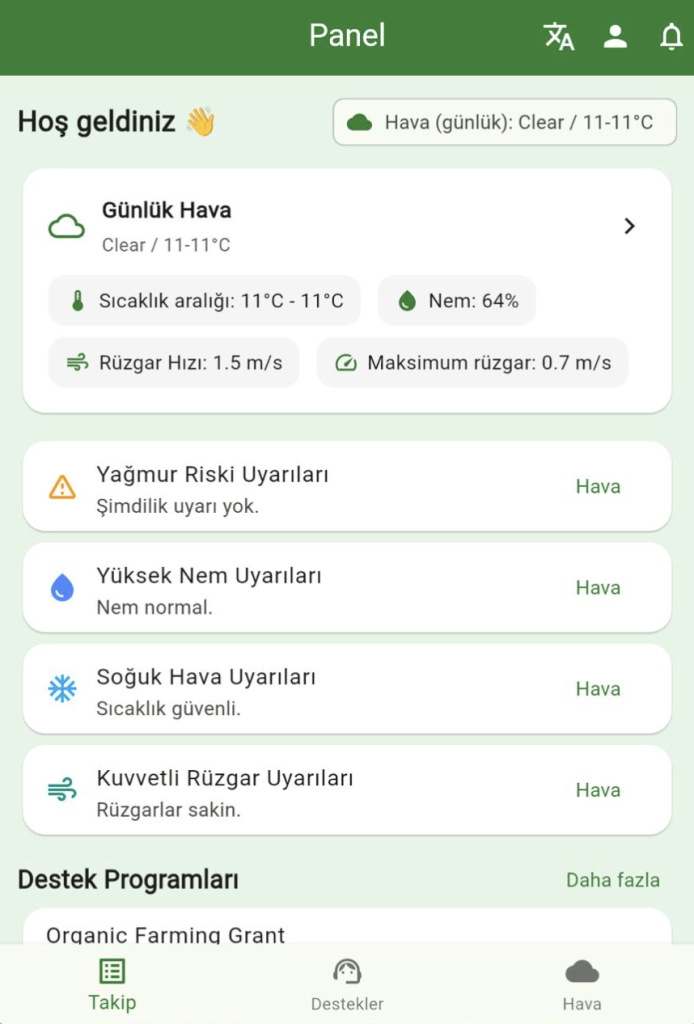 Güncel hava durumu, sıcaklık, nem ve rüzgâr bilgilerine kolayca ulaşabilir, olası riskler hakkında anlık uyarılar alabilir ve mevcut destek programlarını görüntüleyebilirsiniz.